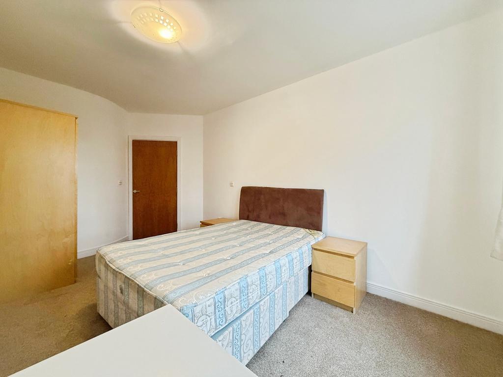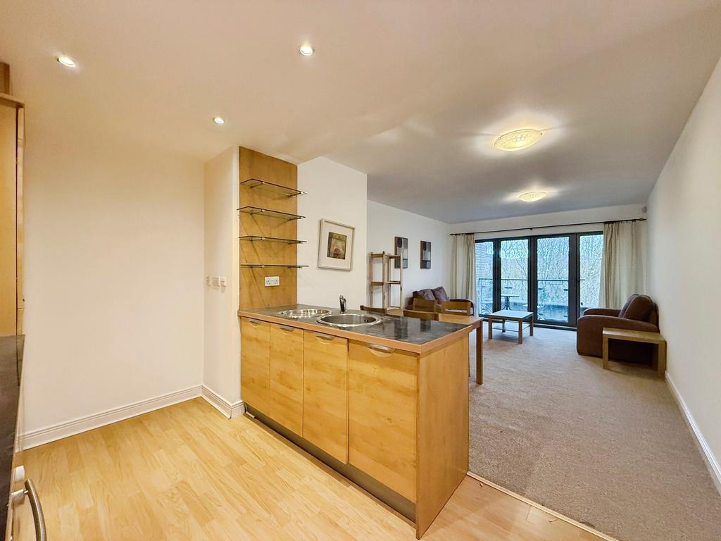 Open-Plan Lounge & Kitchen: A spacious, light-filled living area featuring double doors to a private balcony. The kitchen is fitted with built-in appliances and offers generous cupboard and worktop space—ideal for cooking and entertaining.
