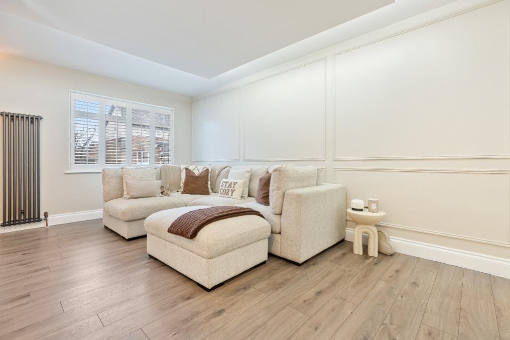Internally, the accommodation is laid out over three levels and consist of entrance hallway, generously sized front facing lounge with a sunny west facing aspect, built in media wall with a focal point electric fireplace below. To the rear and forming the main part of the extension is a stunning, family dining kitchen with integrated appliances and an open aspect family room to the garden. The family area boasts french doors to the garden and a large built in storage cupboard, utility room with front door to driveway and shower room.