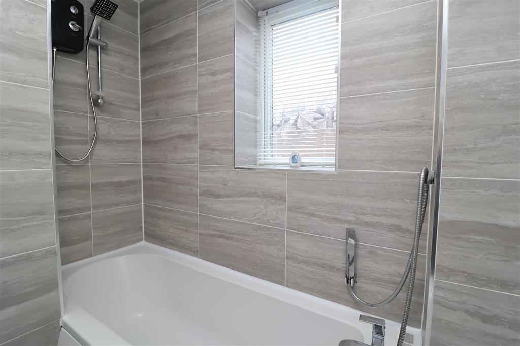 Family Bathroom - The contemporary family bathroom is fitted with a modern white suite comprising a panelled bath with electric shower over, wash hand basin, and WC. Finished with stylish tiling and chrome fittings.