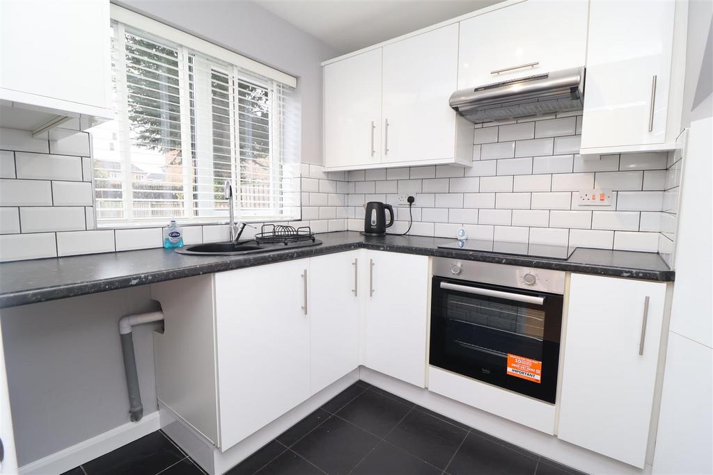 Kitchen - 2.13m x 2.84m (7' x 9'4) - The modern fitted kitchen is equipped with a range of wall and base units, complemented by contrasting work surfaces and tiled splashbacks. Integrated appliances include an oven and hob, with space for additional appliances. A rear-facing window provides excellent natural light.