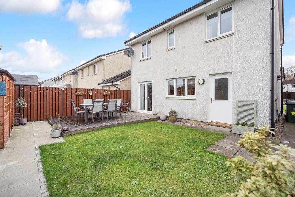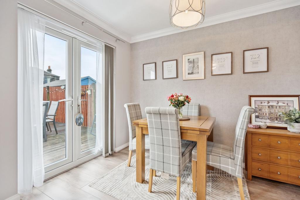 The property enjoys private south facing garden ground to the rear. The garden is enclosed by fencing and features a combination of lawn, paved and decked areas, providing spaces for relaxation and outdoor dining. A timber-built summerhouse is also located within the rear garden. Off-street parking is provided by a private driveway to the front of the property.