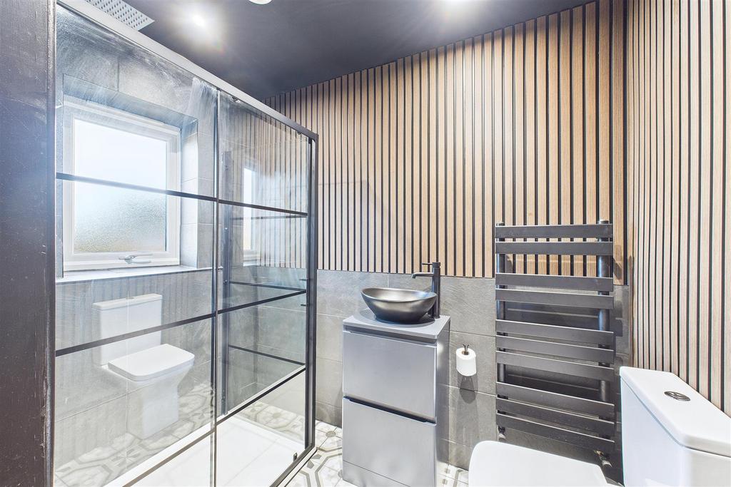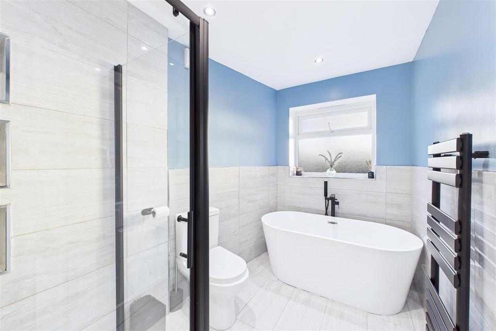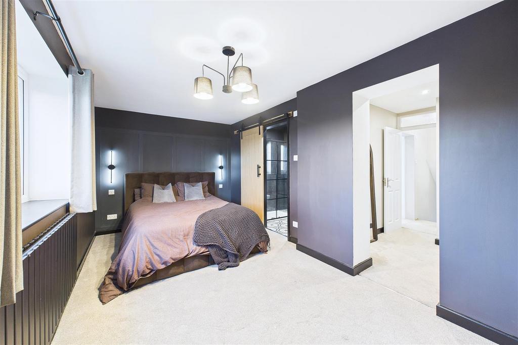 Upstairs, the principal bedroom forms a substantial master suite, featuring a walk-through wardrobe leading to a stylish and luxurious en-suite shower room. Three further bedrooms are well proportioned and served by a modern four-piece family bathroom, making the layout ideal for growing families.