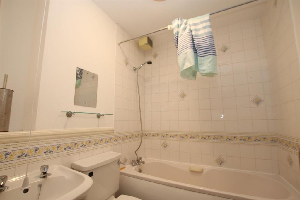 Bathroom - White suite comprising panelled bath with shower attachment, wash hand basin and toilet. Part tiled walls. Vinyl flooring.