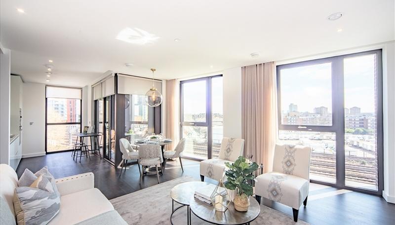 Arranged on the third floor, this beautifully designed home features a spacious open-plan reception room with floor-to-ceiling windows and seamless access to a private balcony, perfect for relaxing or entertaining in style. The fully integrated kitchen, fitted with high-spec AEG appliances, blends effortlessly with the living space, creating a bright and contemporary environment.