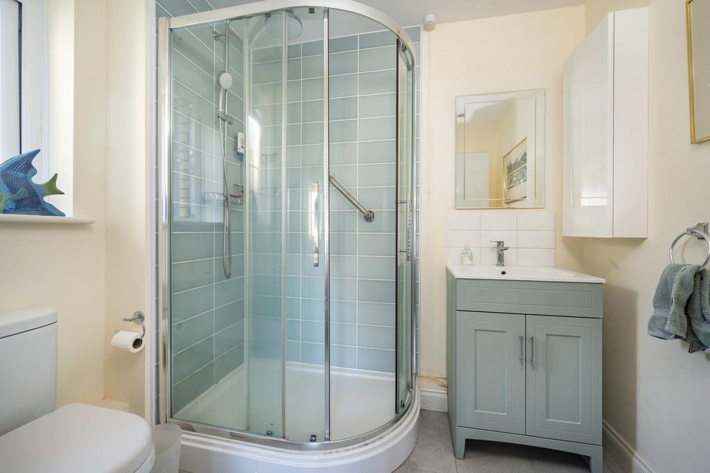 EN-SUITE: Containing a corner shower with rainfall style showerhead and additional attachment below. WC, vanity suite and a chrome heated towel rail.