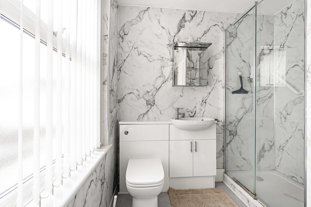 To the first floor are two bedrooms, both with fitted sinks. Bedroom One features a UPVC double-glazed bay window to the front, while Bedroom Two includes fitted storage and a UPVC double-glazed window overlooking the courtyard. A door leads to the family bathroom, offering a modern suite with shower, low-level WC, wash basin and obscure double-glazed window.