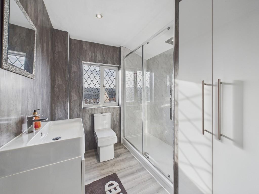SHOWER ROOM With a white three piece suite which comprises of a walk in double shower, vanity wash hand basin, low flush w.c, decorative wall boarding, cupboard housing the central heating boiler and rear facing window.