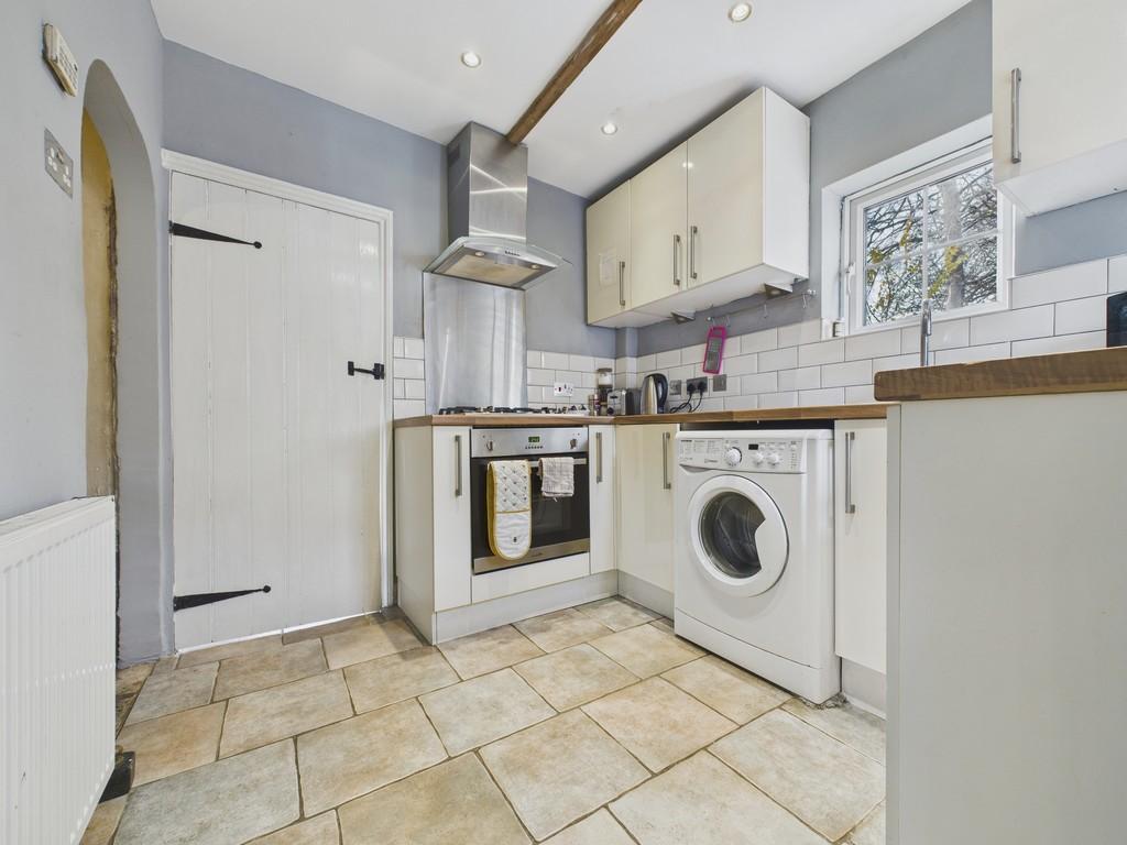 Inside, the kitchen sits to the front of the house and features a clean, neutral design with cream high gloss units, integrated oven, hob, and extractor. Dual aspect windows allow light to flow in from both the front and side, and there's an understairs store to keep everyday items tucked away. This is a neat and functional space.