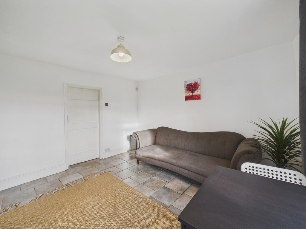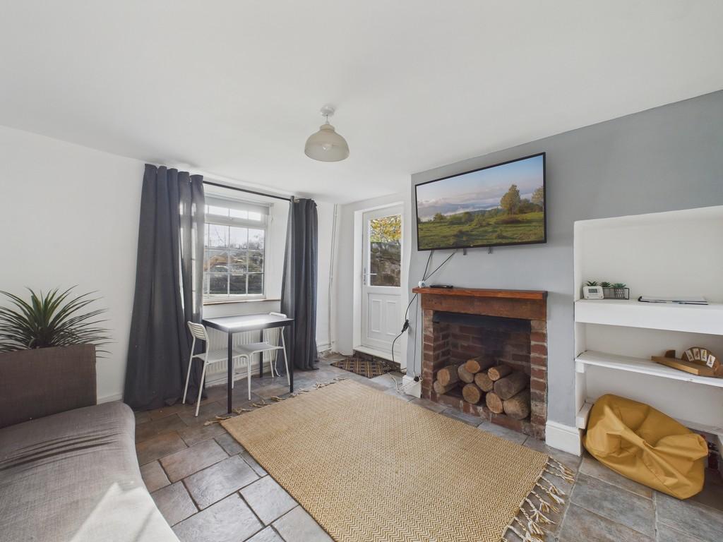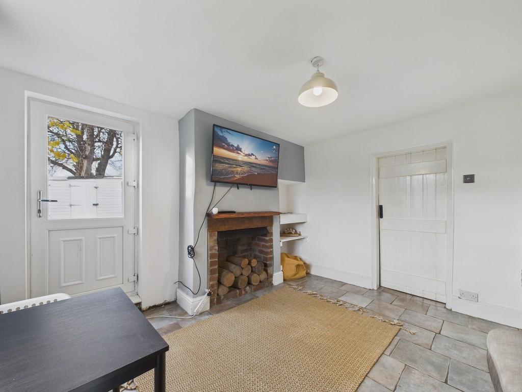 The lounge carries a strong sense of character, with a tiled floor and a feature fireplace giving the room a distinctive feel. The door here opens directly out to the garden, giving easy access to the outdoor space and bringing more natural light into the room.
