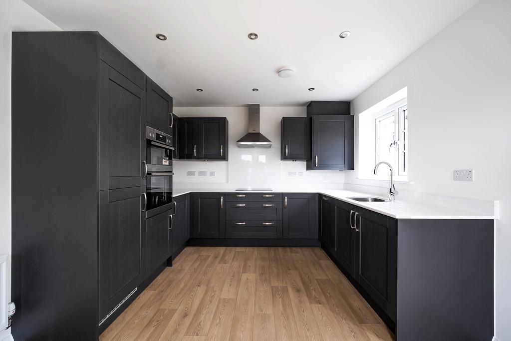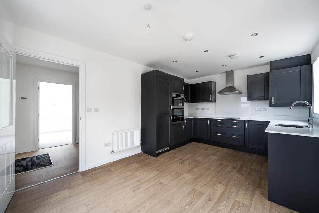 On the ground floor, the welcoming entrance hall provides access to a stylish living room, featuring a bay window that fills the space with natural light. The modern kitchen/breakfast room is fitted with sleek dark units, integrated appliances and ample worktop space, creating a practical yet elegant hub for everyday living. There is also a ground floor cloakroom and direct access to the rear garden, making the layout both functional and family-friendly.