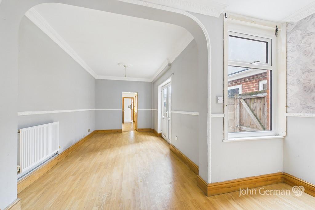 Further along the hall is an 'L' shape sitting/dining room, a spacious room with windows and doors to the garden.