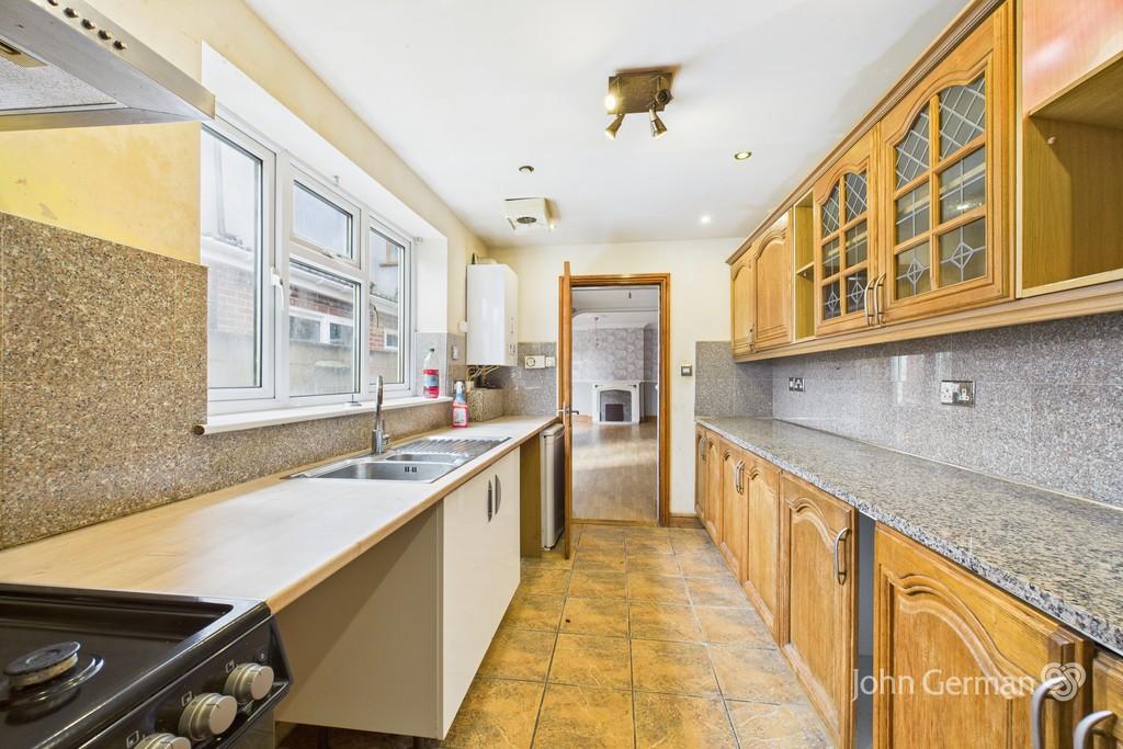 The kitchen is fitted with base and eye level units with space for appliances, window to side and door onto a rear hall leading to the ground floor bathroom.