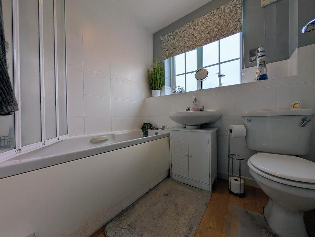 On the first floor there are three bedrooms – two doubles and one single – served by a contemporary family bathroom with bath and separate shower. Externally, the property benefits from a private, enclosed rear garden which is predominantly lawned with a patio area, ideal for outdoor dining and children’s play. To the front there is driveway parking for two vehicles, access to a single garage and well-kept lawn and shrub borders.