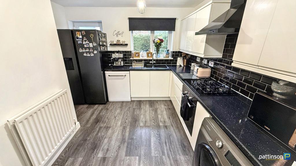 Window to rear with fitted roller blind, access door into the rear garden. Fitted with a range of white high gloss wall, floor and drawer units with black roll edhe worktops and black tiled splashbacks, one and a half black resin sink and drainer with instant boiling mixer tap, integrated gas hob and electric oven with black chimney style extractor over, plumbing for washing machine and dishwasher, wood effect flooring, radiator.