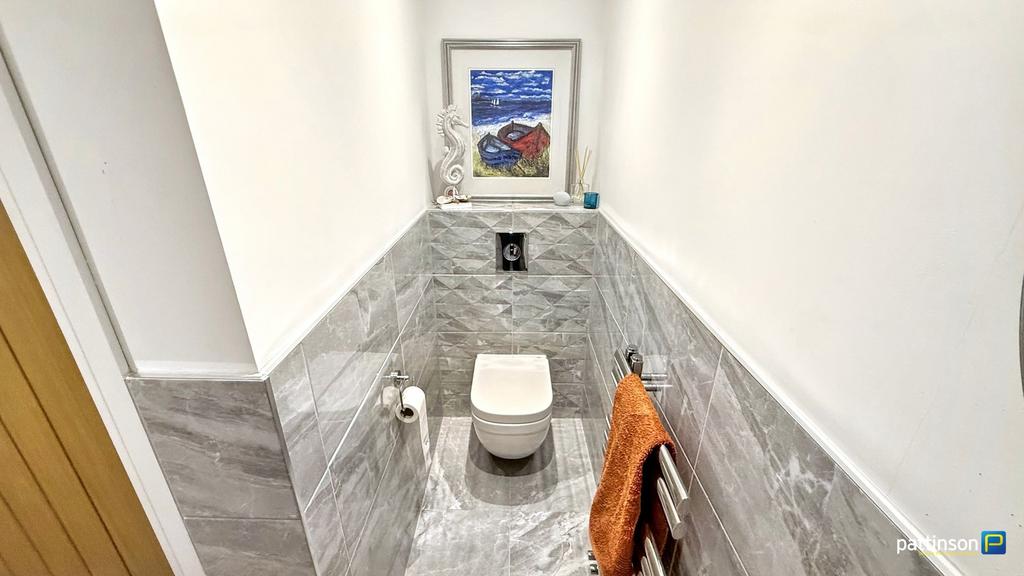 Floating w.c with push flush, compact wash hand basin with vanity drawer, chrome heated towel rail, half tiled walls, tiled flooring, understair storage cupboard.