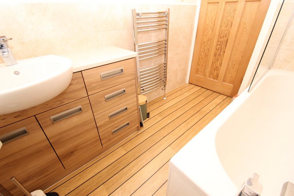having white suite comprising panelled bath with fitted shower unit and glazed screen, wash hand basin in vanity unit, low flush w.c., part tiled walls, ceiling light point, heated towel rail and UPVC double glazed window to rear.