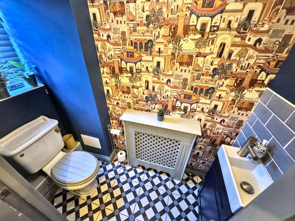 On the first floor, the generous lounge enjoys a stylish well decorated reception room, with windows and French doors opening directly to the stylish, low-maintenance rear garden—perfect for relaxing or entertaining. The open-plan kitchen/breakfast room is fitted with a wide range of contemporary units, a Butler sink, splashback tiling and a freestanding double-range oven with electric hob and cooker hood. This sociable space flows seamlessly into a large dining area with further storage, an oak-topped utility area, Glow-worm boiler cupboard, and tiled flooring throughout.