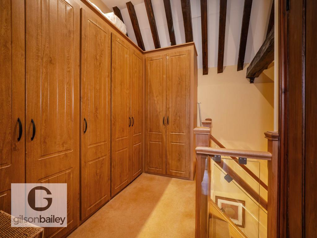 Fitted carpet, built in cupboards/ book shelves, airing cupboard, high vaulted ceiling with exposed beams, door to the rear.