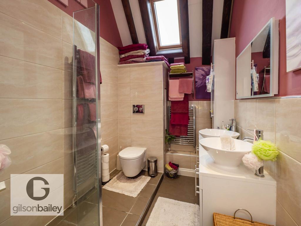 Fitted suite comprising of a large walk in shower, low level WC, his and hers hand wash basins, two heated towel rails, tiled flooring, spotlighting, velux window.