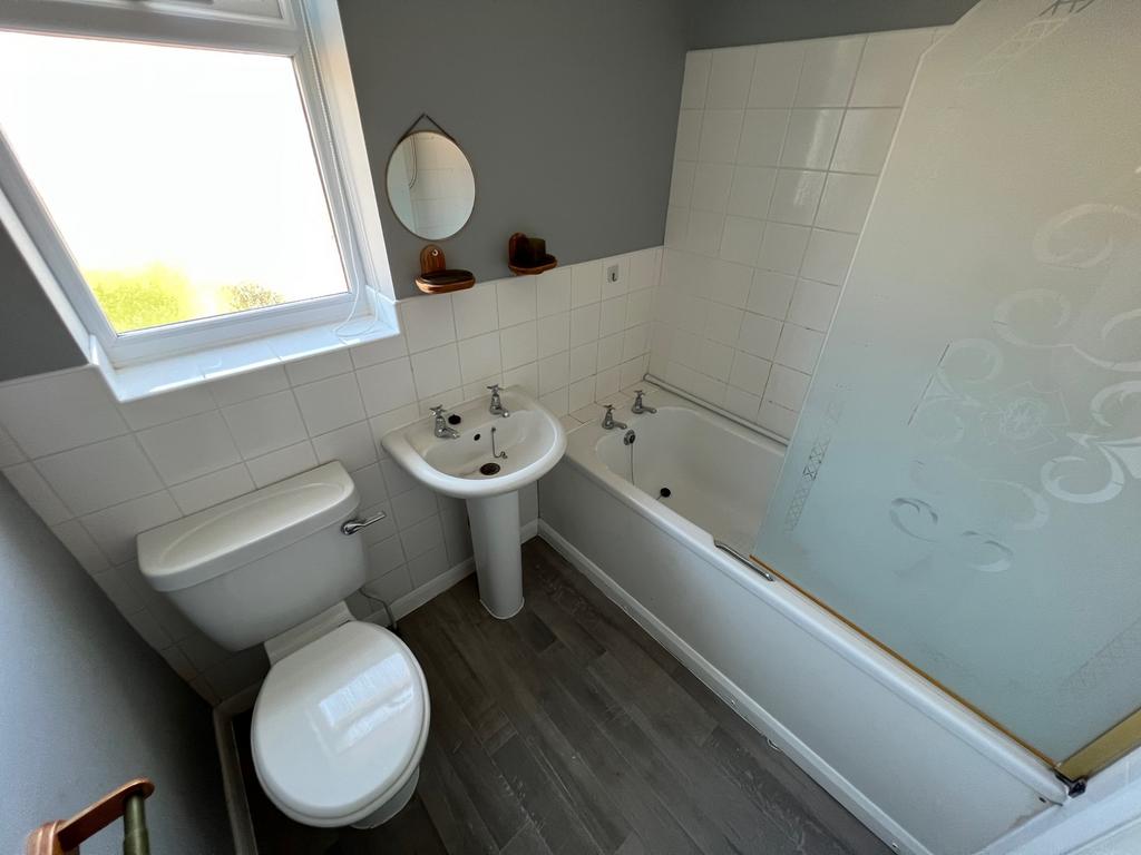 On the first floor there are two bedrooms: one double bedroom and one single bedroom. The bathroom includes a bath with shower over, close coupled toilet and wash basin, forming a straightforward suite ready for updating to a buyer’s taste.