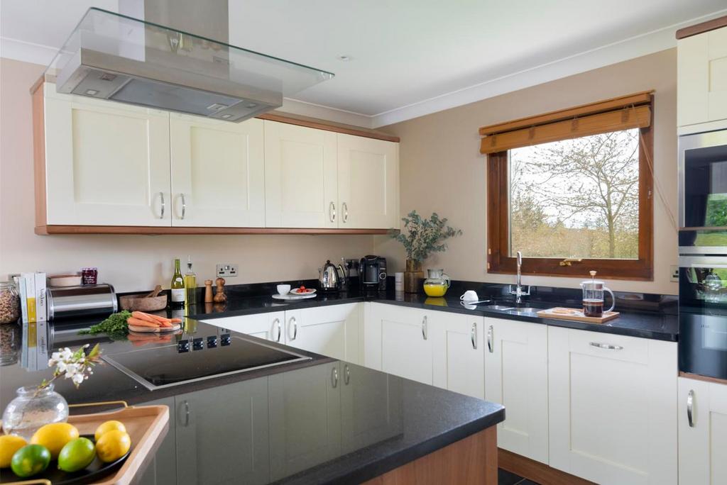The ground floor hosts an open-plan kitchen and dining area, featuring granite worktops and integrated appliances alongside space for family meals or social gatherings. The adjoining sitting room, with its vaulted wooden ceiling and large windows, is bathed in natural light. French doors lead to a private balcony, offering a tranquil setting to enjoy the surrounding greenery.