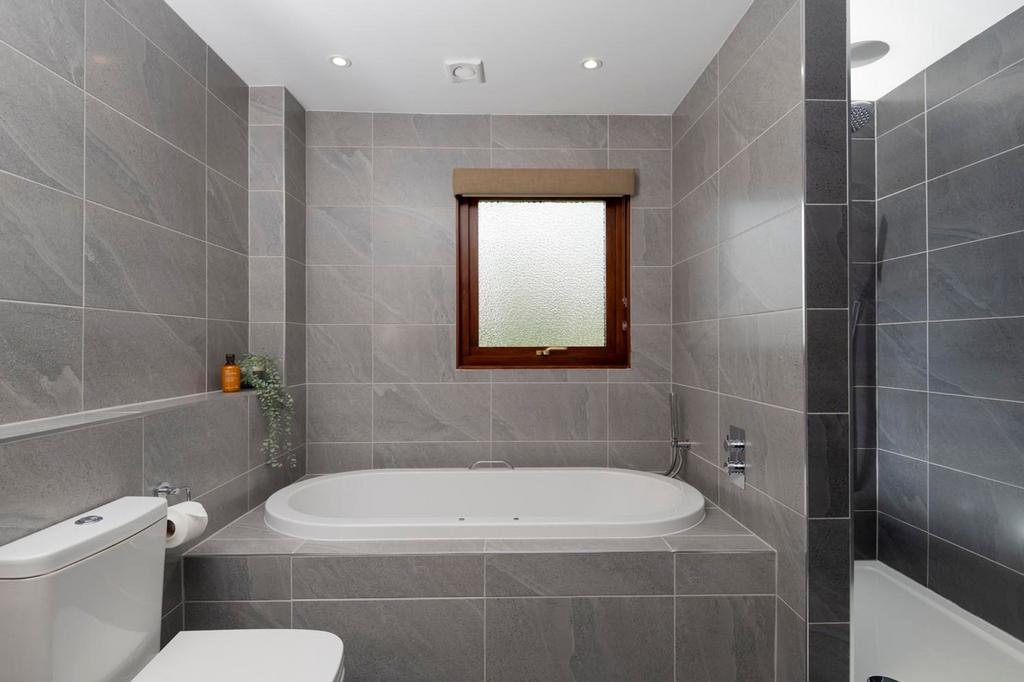 The main level also features two generously sized bedrooms, one with an en-suite shower room and the other served by a family bathroom with a bathtub and walk-in shower. Upstairs, the principal suite is a quiet retreat, complete with an en-suite bathroom and views of the picturesque surroundings.