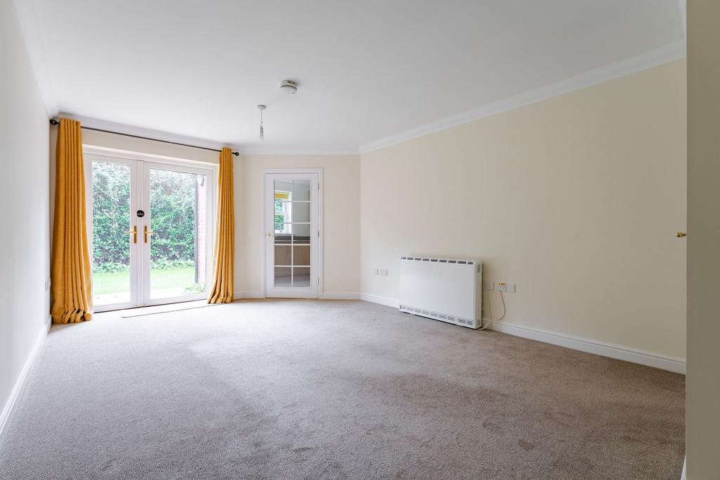A welcoming hallway leads into a bright, well-proportioned living area, carpeted and arranged for effortless everyday use. French doors open directly onto a small private patio area leading onto the communal gardens, offering a lovely connection to the outdoors during the warmer months.