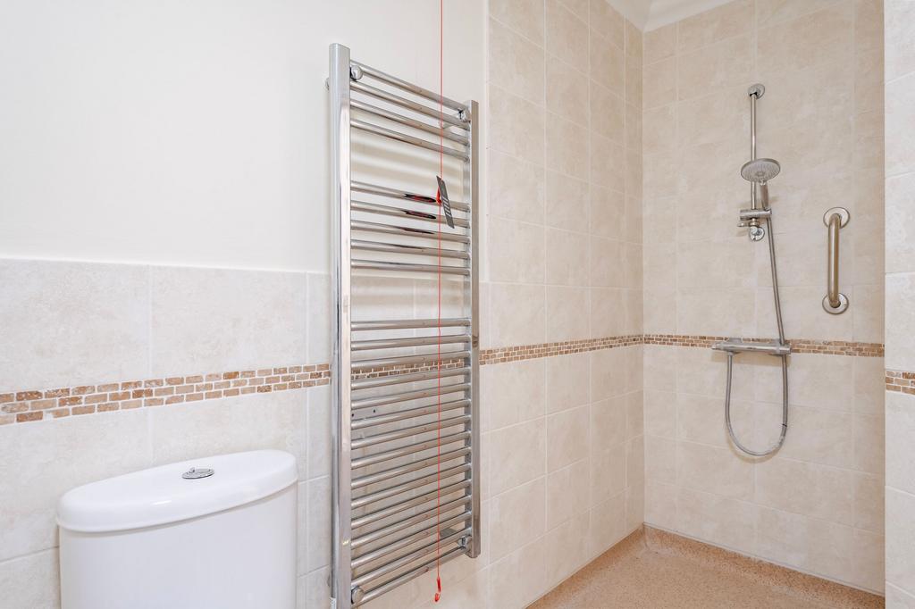 The bathroom offers a safe and accessible space, featuring a walk-in shower, separate bathtub, hand wash basin and WC.