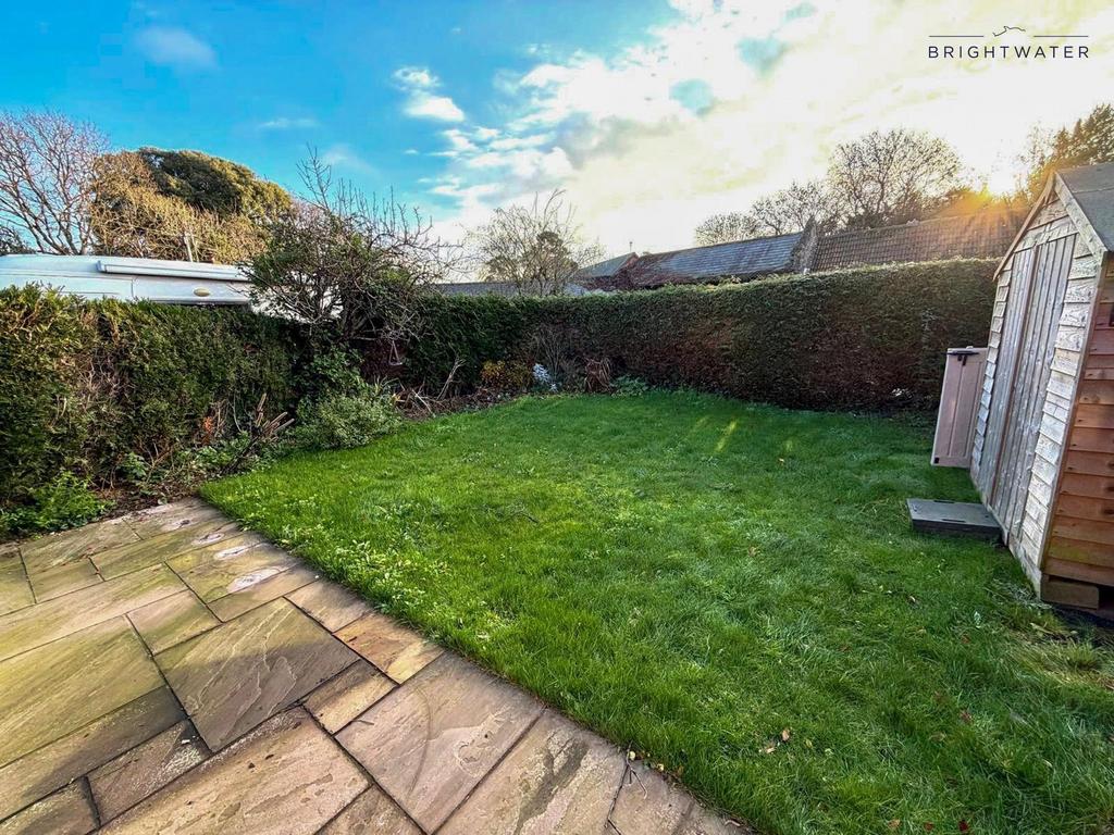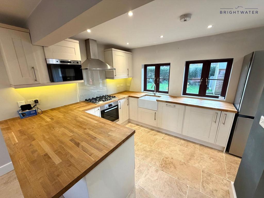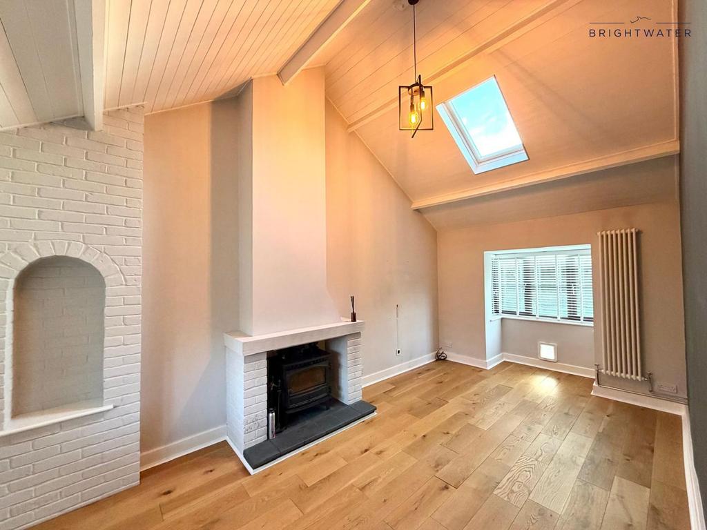 The property features a large double-aspect living room with a vaulted ceiling, creating a bright and airy space, complemented by a feature fireplace with log burner. To the front is a south-east facing garden which is partially laid to lawn and includes a patio area, ideal for outdoor dining. The garden also benefits from a wood store and separate storage unit.