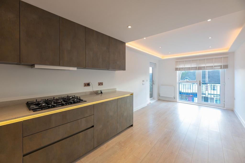 Double glazed window to the front, double glazed door to the south facing balcony, smooth ceiling with inset feature lighting and spotlights, wall and base level units with square edge worktops over, butler sink with mixer tap, five ringed gas hob, eye level double oven, integrated washing machine and fridge freezer and radiator.