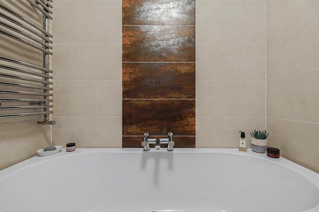 Ensuite - 2.49m x 1.83m (8'2" x 6'0") - A quality appointed fully tiled ensuite comprising a double ended bath, semi pedestal wash basin, low flush wc and separate shower. Obscure window and heated towel rail.