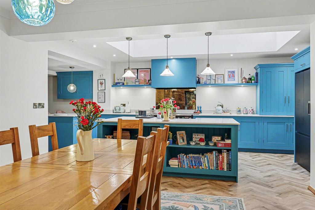 Dining Kitchen - 7.24m x 5.33m (23'9" x 17'6") - A fabulous and extremely spacious high end space with room for dining table etc...with a roof lantern and Harvey Jones hand painted kitchen with a huge island unit all finished with a pale quartz work top including a double Belfast sink, Rangemaster Range cooker with hood over, integral NEFF dishwasher and built in space for an American style fridge freezer. The dining kitchen is open plan to the family room. A door opens to the side of the property.
