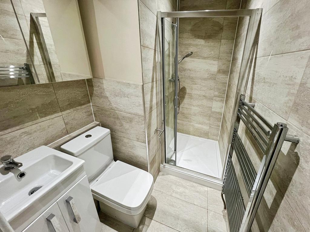 1.34m x 2.28m (4' 5" x 7' 6") Skimmed ceiling, extractor fan, tiled walls, wall mounted chrome towel rail heater and tiled flooring. Three piece suite comprising low level WC, wash hand basin set within vanity unit and shower cubicle with chrome mains fed shower with rainfall head and glass sliding door.