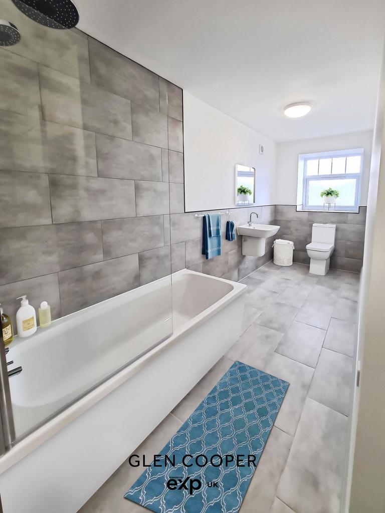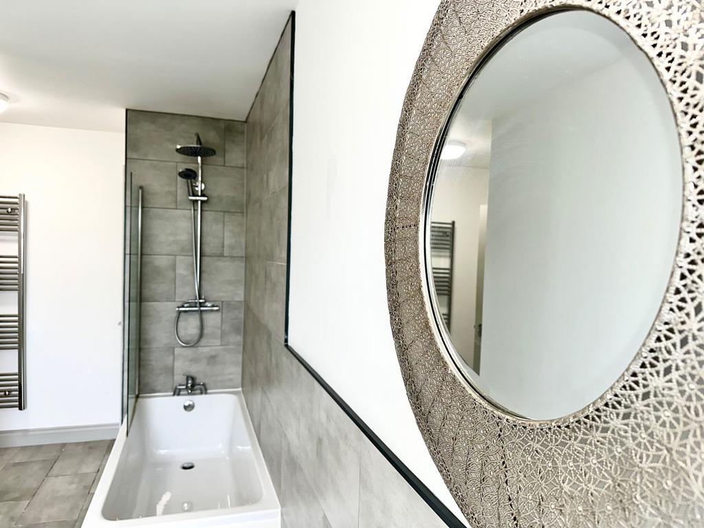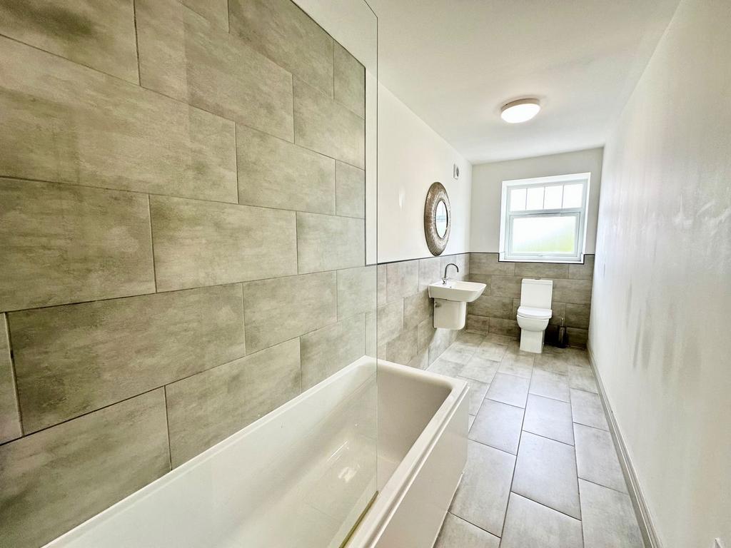 This is a huge bathroom with storage cupboard, Sink, Wc and a modern bath with overhead shower a rear treat for bath or shower time it has loads of additional space.
