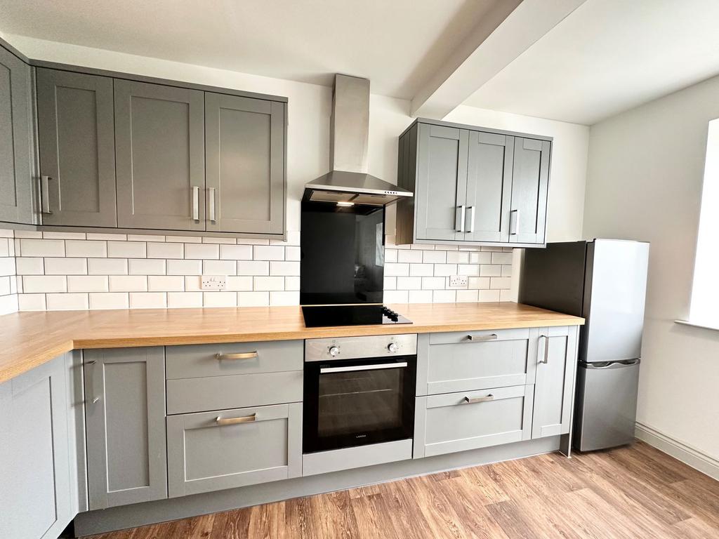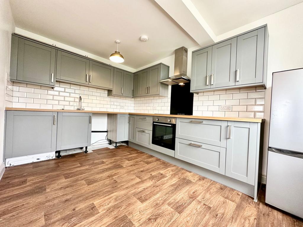 Modern spacious and fully fitted with inbuilt cooker, hob and extractor fan. In addition, you have an integrated washer and fittings for a dishwasher. There's plenty of space for a small table. Loads of cupboard space plus work surfaces. Its light and bright and very modern.