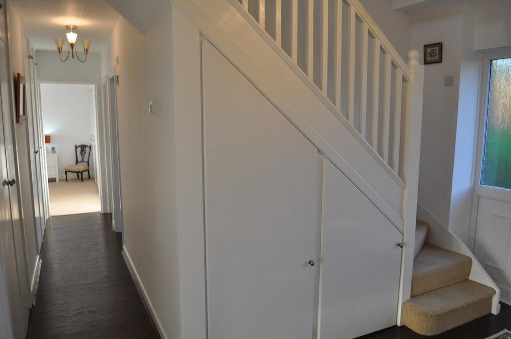 HALL - Heavy duty ‘dark Oak’ laminate flooring. Papered ceiling with coving. Picture rail. Built in cupboards. Staircase to first floor with storage cupboards under. White panelled doors to rooms off.
