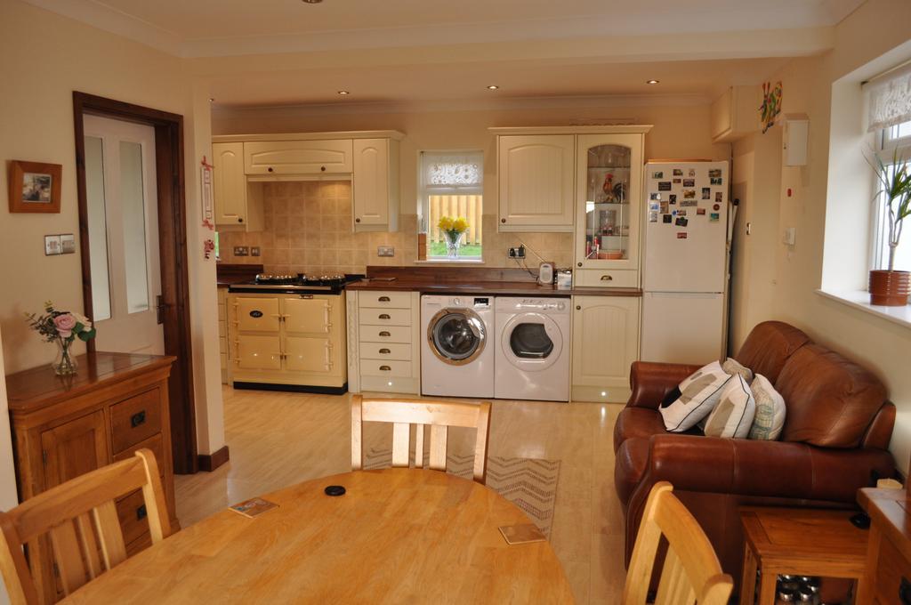 KITCHEN / DINING - L shape 23’0 x 22’0 Well appointed with an extensive range of cream cottage style wall and base cabinets with ‘aged’ brass furniture. Teak effect work surfaces with stone effect ceramic wall tiling over. Stainless steel power points and light switches. Ceramic sink unit with chrome mixer tap over. AGA Range Master ‘Classic’ oven / grill with ceramic hob. Extractor hood over. Wine fridge. Plumbing for washing machine. Space for dishwasher and tumble dryer. Coved ceiling with spot lights. Limestone effect ceramic floor tiling. Two uPVC double glazed windows to front. uPVC double glazed window to side. uPVC double glazed patio doors to rear extensive south facing terrace overlooking Port Eynon Bay and The Bristol Chanel. Covered walkway from kitchen to adjoining garage. The walkway accesses front and rear gardens with two radiators.