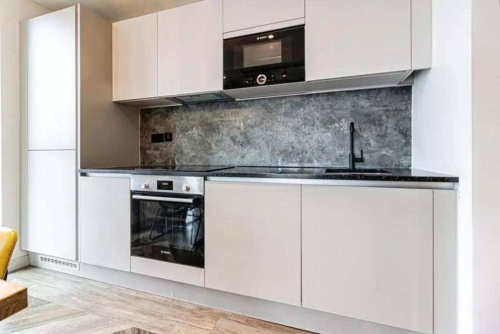 The apartment itself is finished to the highest specification, featuring bespoke furniture, exposed concrete ceilings, Minerva worktops, and Bosch integrated appliances. The heating system includes air source heat pumps with underfloor heating, ensuring both comfort and eco-friendliness.