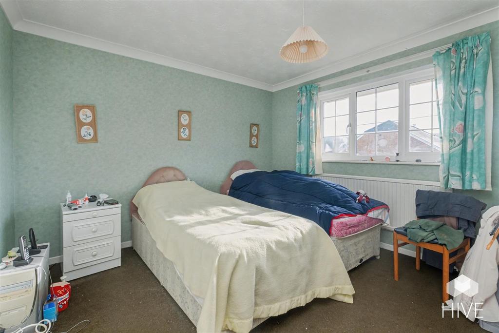 Set back from the road, the large front garden and wide driveway provide privacy and a strong presence. A detached garage sits alongside, with turning space for easy access. To the rear, the garden is wonderfully private — enclosed by mature evergreens — and features a summer house. Side access is available on both sides of the property.