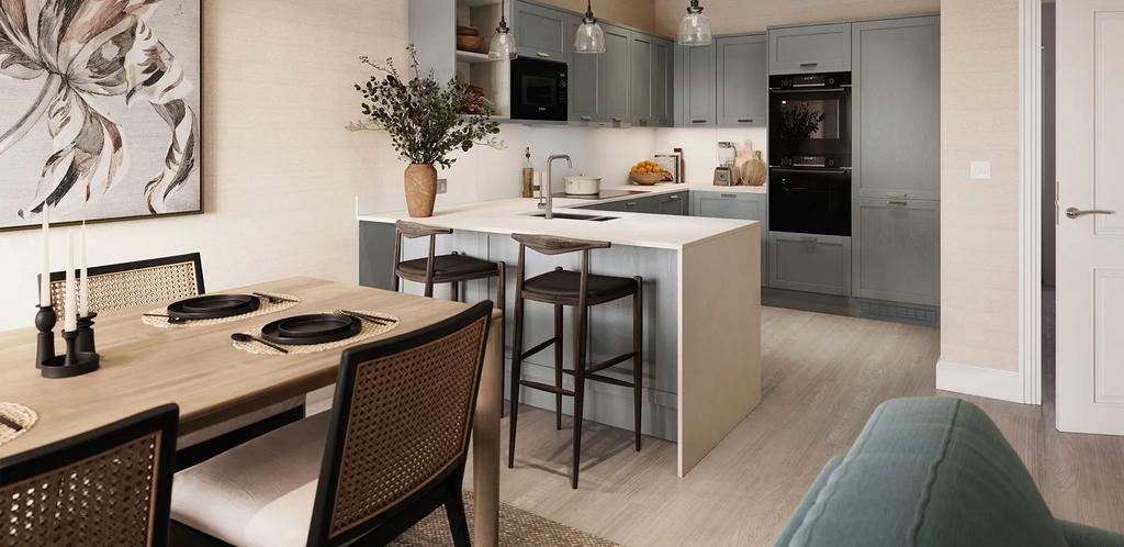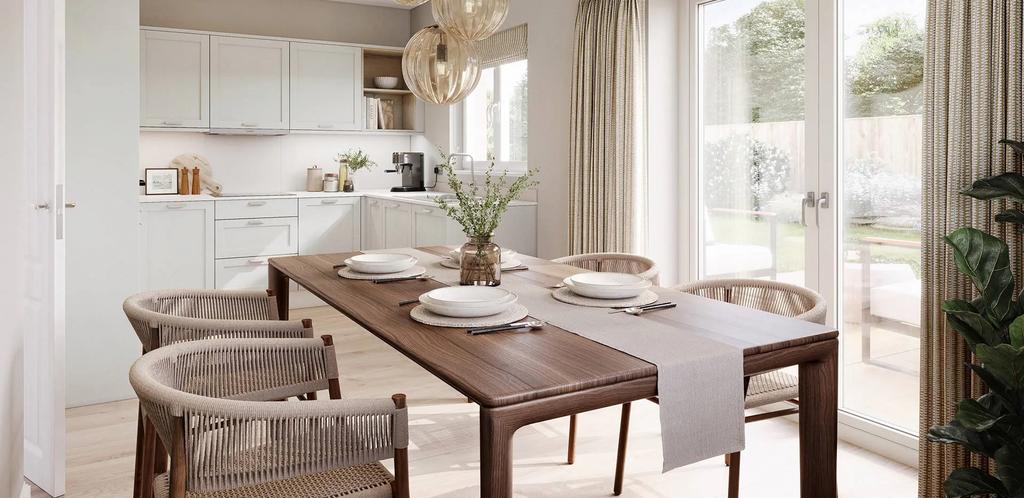 Arranged over multiple floors, the home provides a well-balanced layout designed for modern family life. The ground floor features a spacious open-plan kitchen, dining and living area, creating a natural hub for everyday living and entertaining, with large windows enhancing natural light throughout. The kitchen is finished to a contemporary standard with clean lines and practical storage, while the living areas offer flexibility for family use and social occasions.
