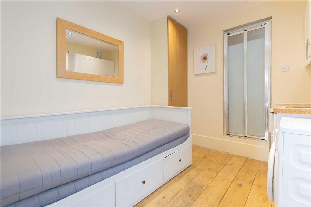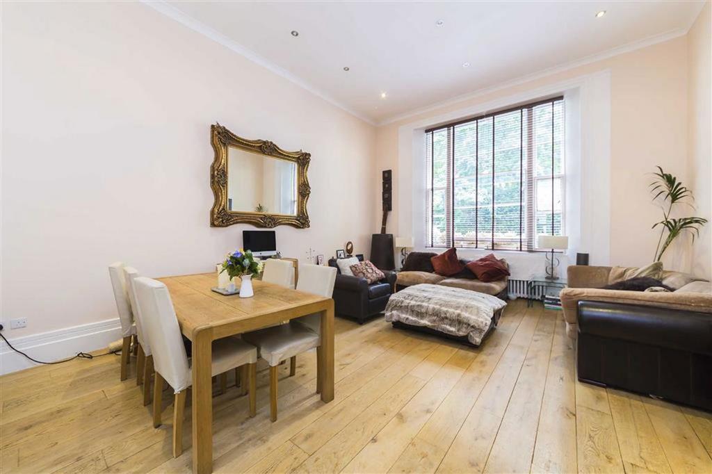 A large ground floor one bedroom apartment with high ceilings and access to a communal garden square. Layout includes wooden floors, an open plan reception, a modern bathroom and a large bedroom.
