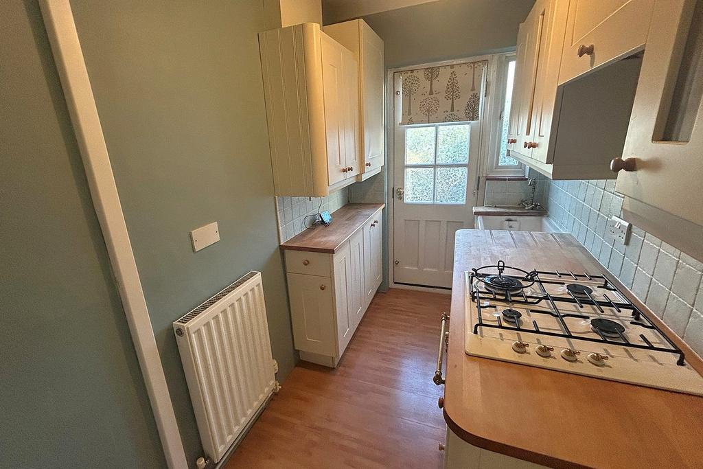 Abt. 5' 2" x 10' 5" (1.57m x 3.17m) A well-appointed kitchen comprising a good range of eye and base level units with roll edge work surfaces. Butler sink. Built in 4 ring gas hob, oven and extractor hood. Plumbing for automatic washing machine. Space for fridge/freezer. Double glazed door leading to rear staircase.