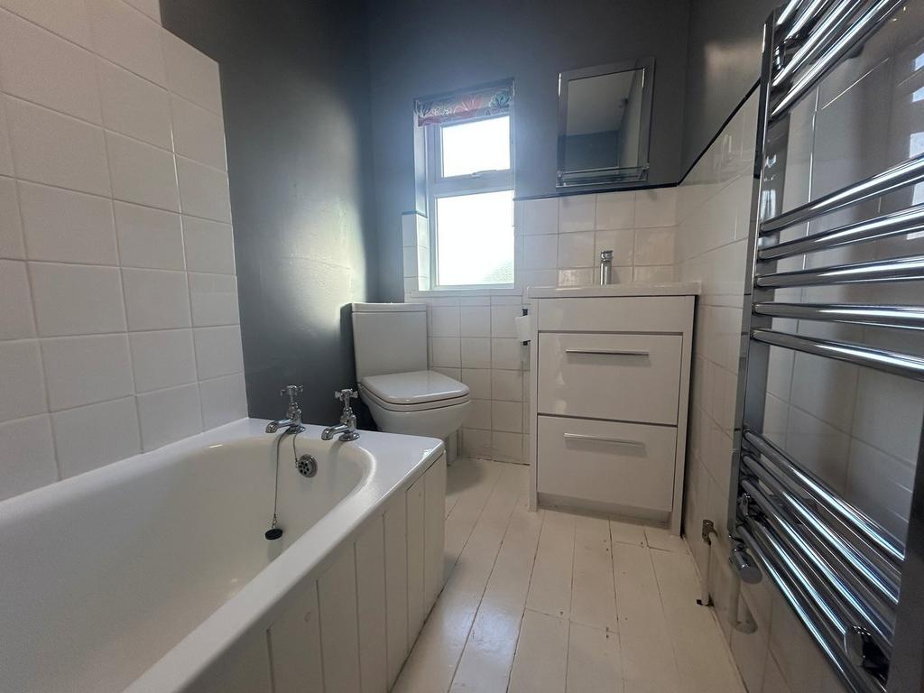 Abt. 4' 4" x 8' 7" (1.32m x 2.62m) A white suite comprising panel bath with mixer tap, shower and a glass shower screen. Pedestal wash hand basin and low-level W.C. Part tiled walls. Heated towel rail. Double glazed window to rear.