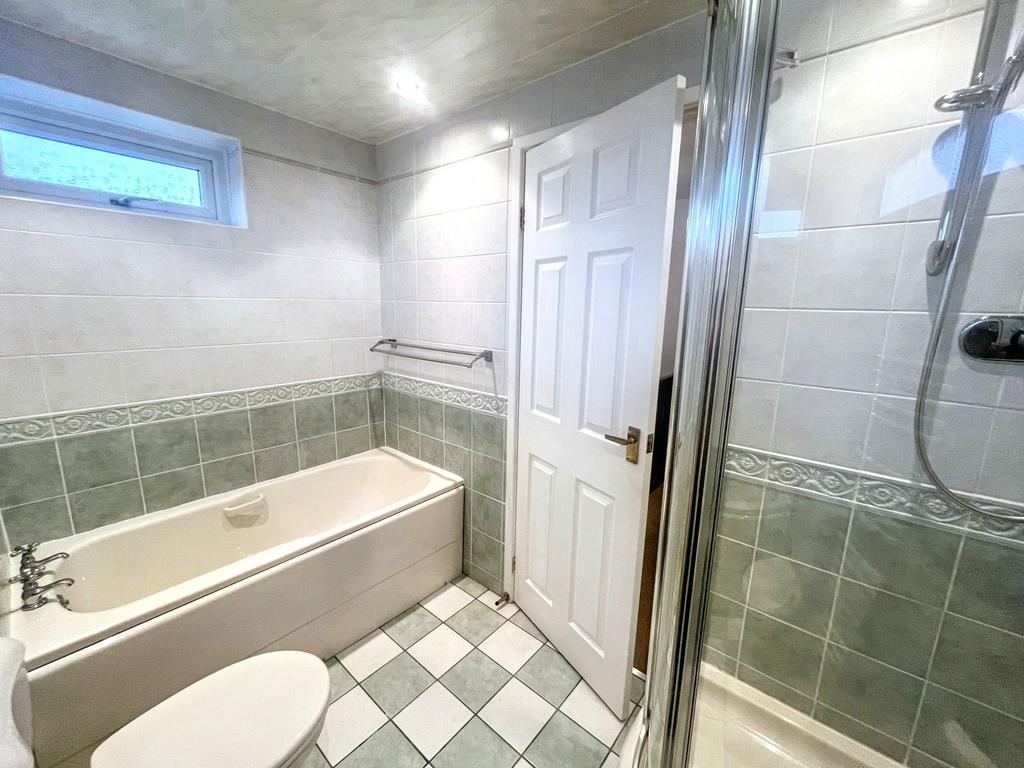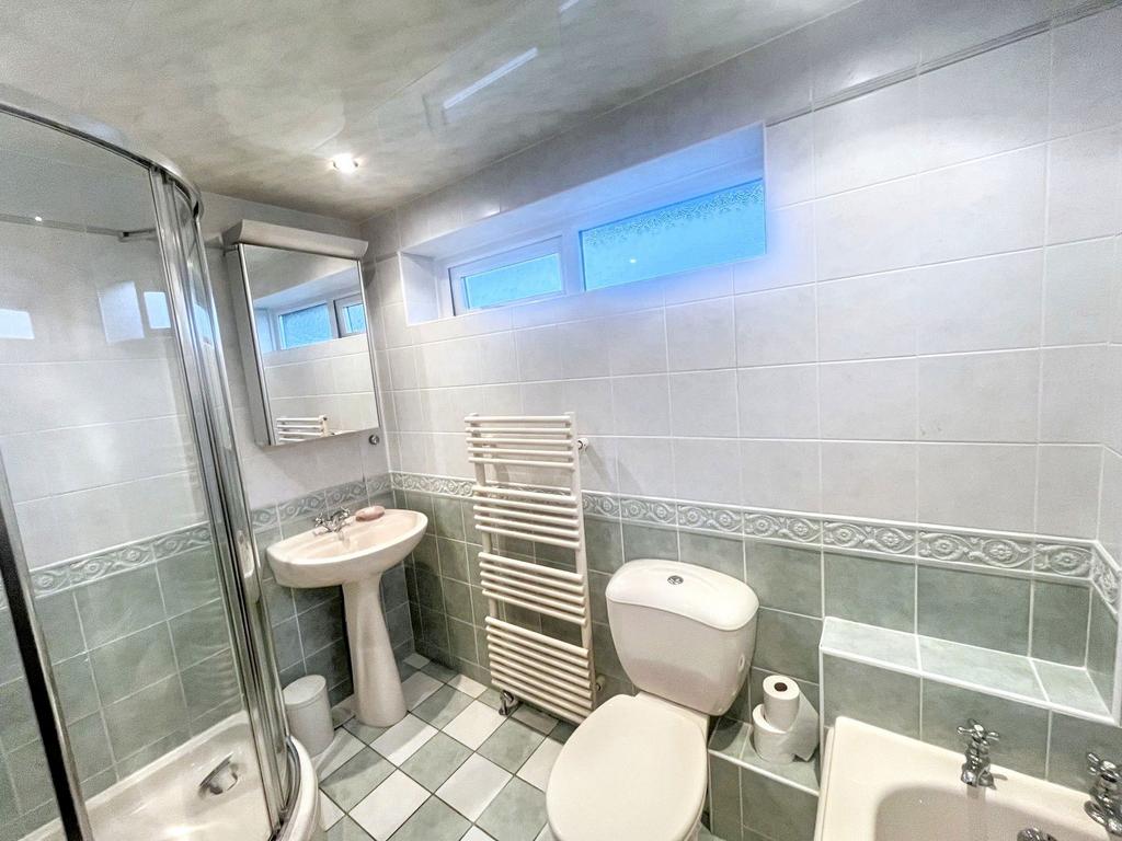 Downstairs shower room fitted with a wc, hand wash basin and shower, tiled walls and a small double glazed window to side elevation.