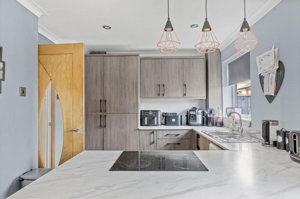 This beautifully presented four bedroom semi detached home is situated in a quiet cul de sac, offering an open aspect to the front and a welcoming sense of space. The property has been thoughtfully extended to provide flexible family accommodation, including a spacious open plan kitchen and dining area that forms the heart of the home. The ground floor also features a versatile fourth bedroom with its own modern ensuite shower room, ideal for guests or as a private retreat for a family member. Upstairs, there are three well proportioned bedrooms and a contemporary family bathroom, all finished to a high standard. The neutral decor throughout creates a bright and airy atmosphere, while double glazing and gas central heating ensure comfort all year round. Ample storage solutions are integrated throughout the property, making it both practical and stylish for modern living.