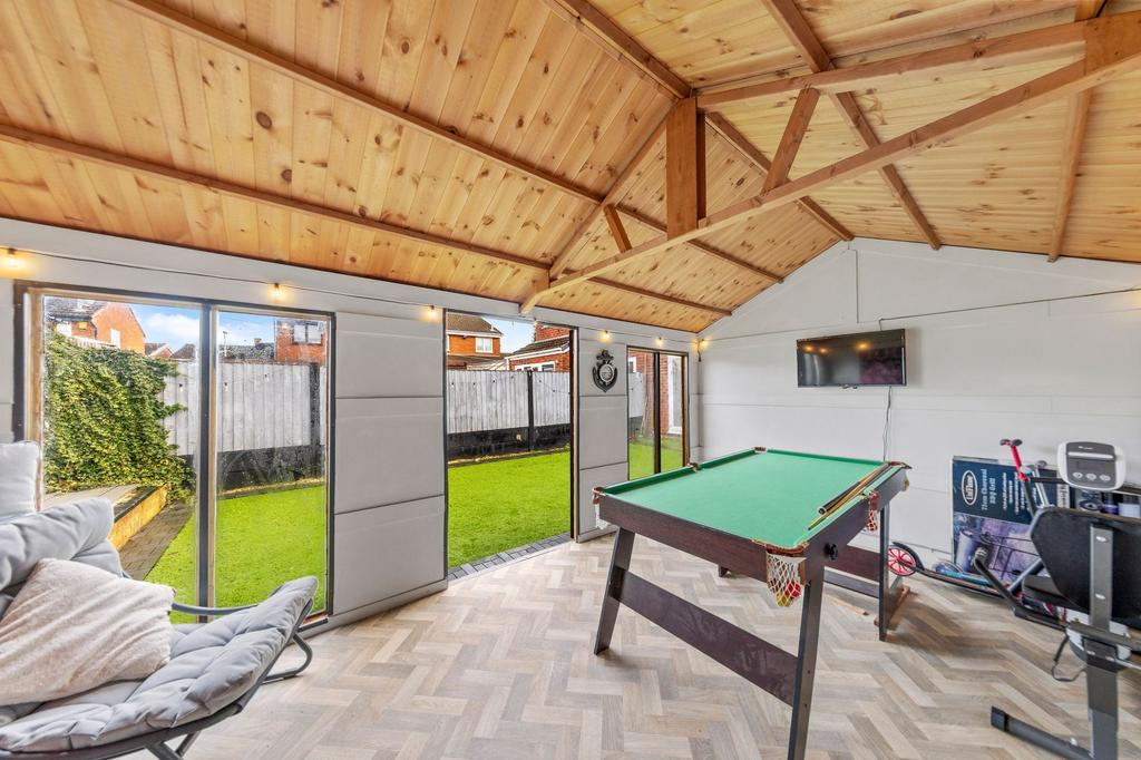 To the rear of the house is a low maintenance garden, designed for ease of upkeep without sacrificing outdoor enjoyment. The garden features a well maintained artificial lawn and a paved patio, providing the perfect setting for al fresco dining or relaxing in the sunshine. A standout feature is the garden room (currently used as a home office or gym), which offers additional flexible space to suit a variety of needs. The property also benefits from off road driveway parking to the front, accommodating multiple vehicles with ease. The peaceful cul de sac location ensures minimal traffic and a safe environment for families, while the open aspect to the front enhances the sense of privacy and space. With its combination of modern living, practical features and appealing outdoor areas, this home is ideal for families or professionals seeking a move in ready property in a sought after residential setting.