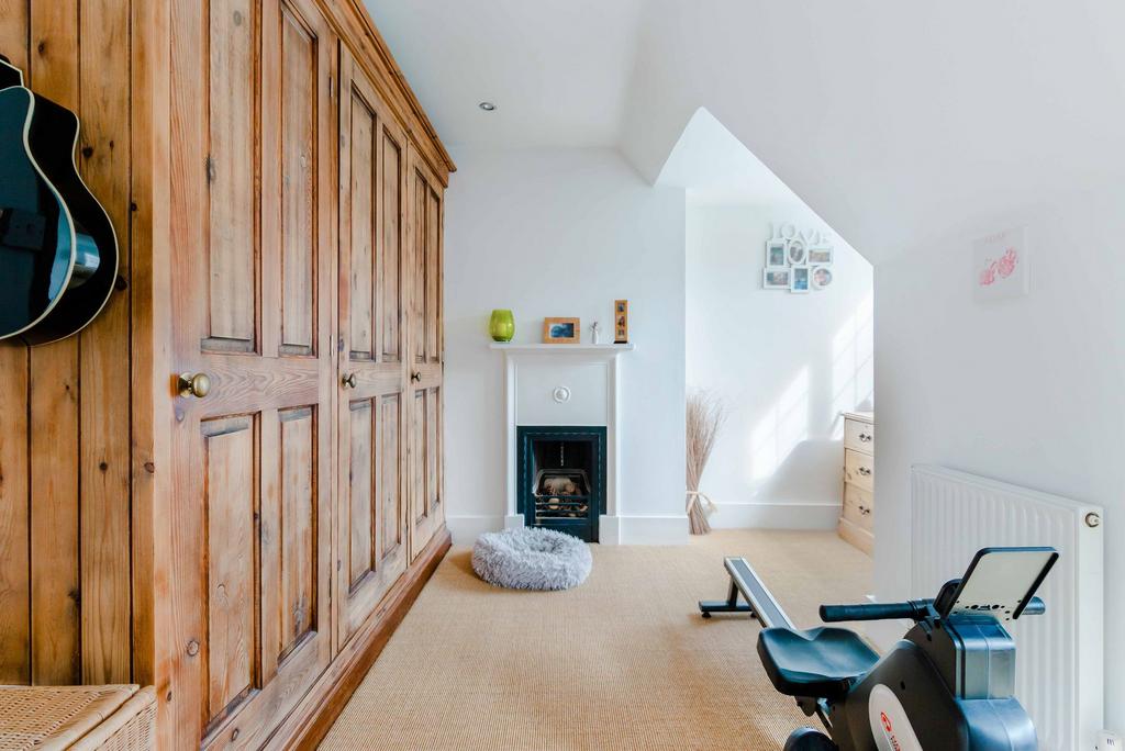 The first floor provides a landing, an impressive 19’2 x 13’4 principal bedroom with dressing area, Juliet balcony, and original fireplace. There is a second double bedroom, also featuring an original fireplace, and a family bathroom comprising a white suite and enclosed bath with overhead shower.