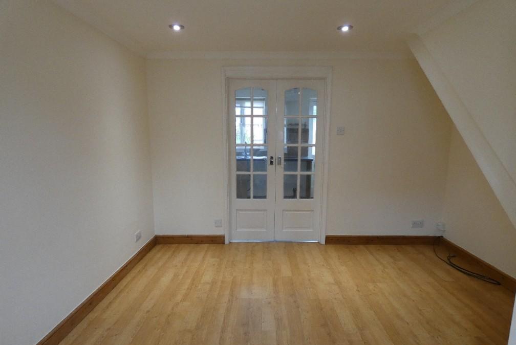 Coving and spotlights to ceiling. Double glazed leaded bay window to the front aspect. Laminate wood flooring, electric storage heater, glazed double French doors to: