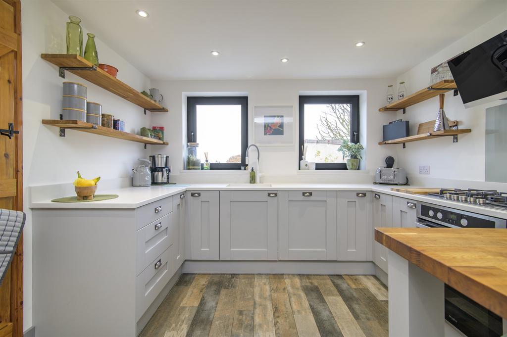 To the left, a timber door opens into the thoughtfully designed kitchen, fitted with bespoke cabinetry and sleek white quartz work surfaces that flow seamlessly into a matching splashback. An integrated sink and drainer, fitted dishwasher and space for a large fridge-freezer ensure the kitchen is as functional as it is stylish, while a front-facing window frames the far-reaching views. A breakfast bar offers a relaxed space for morning coffee or casual dining.