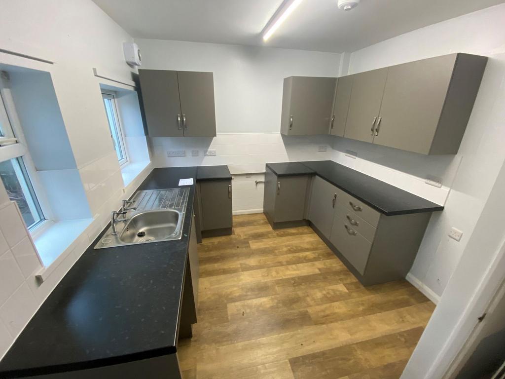 Upvc double glazed windows and door to rear, modern range of base units, wall cupboards and work surfaces, single drainer sink unit, radiator.